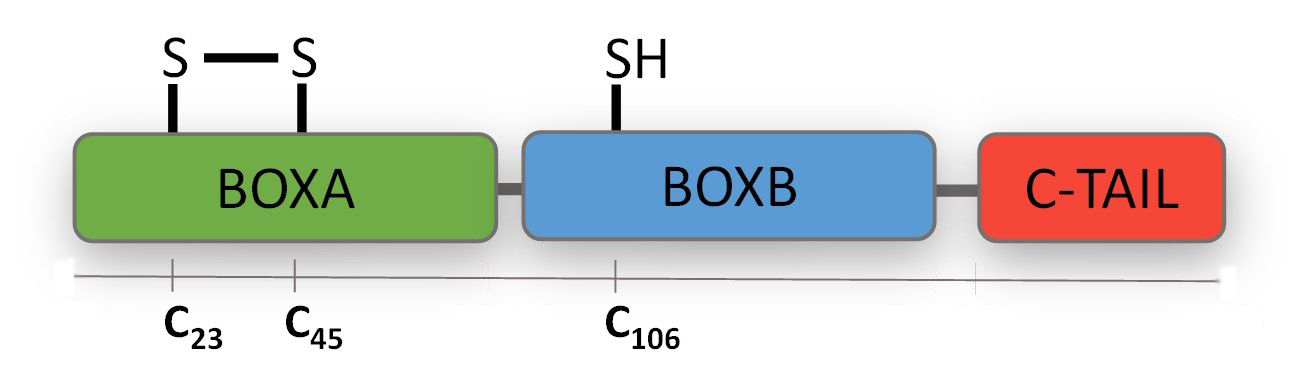The two different activities of HMGB1 as a chemoattractanct of motile cells and as inducer of cytokines have been attributed to different biochemical forms. Fully reduced HMGB1 (the form with chemoattractanct activity) is completely reduced; disulfide HMGB1 contains a disulfide bond between C23 and C45 (complete notation: HMGB1C23-C45C106h – Antoine J. et al (2014).Mol Med).